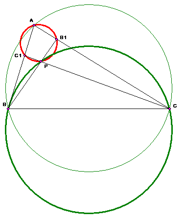 Действительно, центры будут совпадать в том и только в том случае, когда точки АС1РВ1 будут лежать на одной окружности. Пусть, для определенности, Р расположено «над» прямой ВС. Поскольку около четырехугольника можно описать окружность тогда и только тогда, когда сумма его противоположных углов составляет развернутый, должно иметь место равенство
