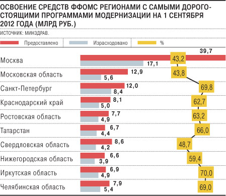 По официальным данным Минздрава, на 1 сентября 2012 года освоено 64,6% (295,4 млрд руб.) из предоставленных ФФОМС 318 млрд руб. При этом динамика освоения средств фонда регионами выглядит так: на 1 января было израсходовано 53%; на 1 июня — 56%; на 1 июля — 58%; на 1 августа — 62%. Несложно подсчитать, что такими темпами программы будут выполнены к концу года на 80%. Средства из бюджетов регионов и территориальных фондов осваиваются еще медленнее — по данным на 1 сентября, 53% и 63% соответственно. По информации "Ъ", Минздрав планирует выйти с инициативой продлить программы модернизации на 2013 год, поскольку некоторые регионы и вовсе не справляются с задачей. Так, например, Тверская область на 1 сентября израсходовала деньги ФФОМС на 39%; Москва — на 43%; Московская область — на 43,8%; Калужская область — на 46,8%; Свердловская область — на 48,7%; Республика Тыва — на 52,8%. Квоту слабых регионов Минздрав планирует перераспределять в пользу сильных.