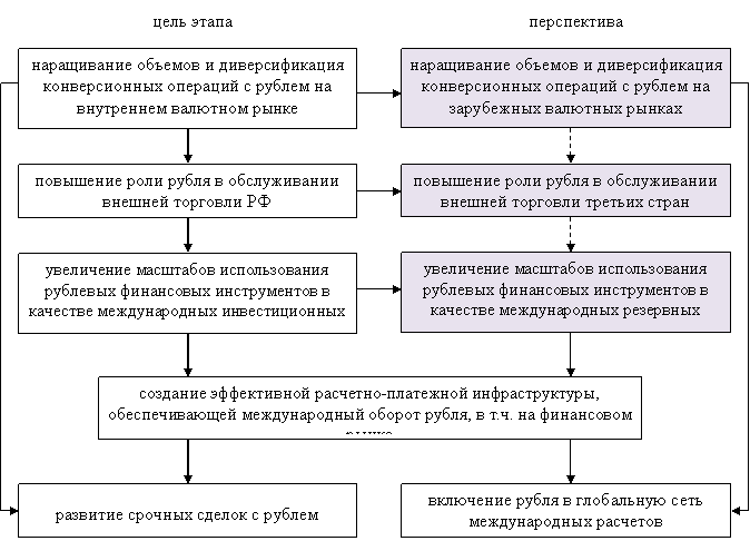 , стимулированию инновационного экономического роста, снижению инфляции, повышению стабильности курса рубля, совершенствованию финансового рынка и увеличению его привлекательности для иностранных инвесторов; увеличению доли использования рубля в международных расчетах. В качестве долгосрочных целей можно указать превращение рубля в резервную валюту и создание межгосударственных валютных структур с участием РФ, а также диверсификацию структуры экономики, устранение зависимости от сырьевых источников, что ликвидирует влияние колебаний мировых цен на энергоносители на состояние российской экономики.