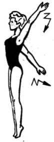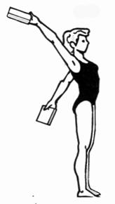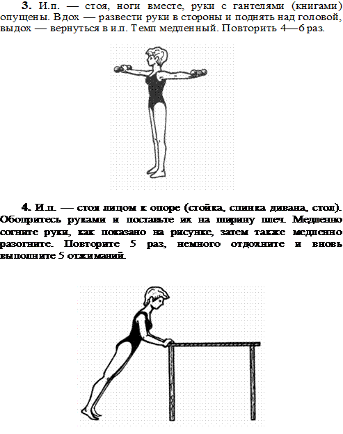 2. И. п. — стоя, ноги вместе, в прямых опущенных руках гантели или книги. Одно временно делать мах правой рукой вверх, левой назад, прогибая спину. Затем поменять положение рук. Повторить 8—10 раз. Темп средний. Дыхание не задерживать.