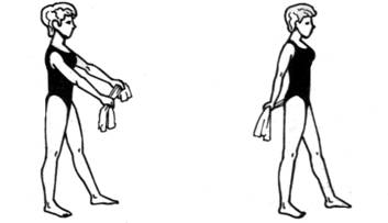 2. И. п. — стоя, ноги на ширине плеч, в руках полотенце (платок, скакалка). Вытянуть руки вперед, затем поднять над головой и опустить назад за лопатки, не сгибая в локтевых суставах. Затем также медленно вернуть руки в и. п. Постепенно сокращая расстояние между кистями рук, вы будете увеличивать подвижность плечевого сустава. Повторить 4—6 раз.