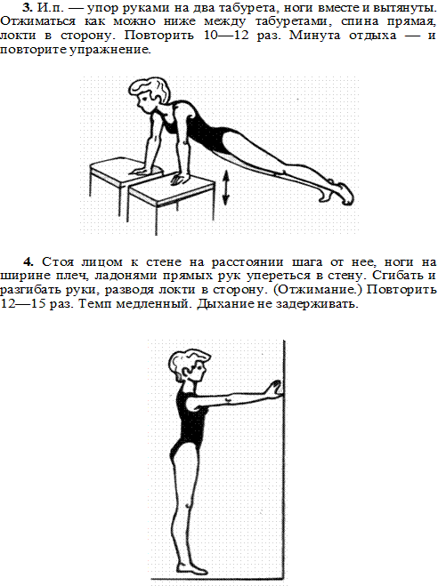 2. И. п. — то же, но руки согнуты в локтевых суставах. Напрягая мышцы ног и ягодиц, выполните 6—8 «шагов» вперед и столько же назад. Спину старайтесь держать прямо. Повторите по 3—7 раз вперед и назад.