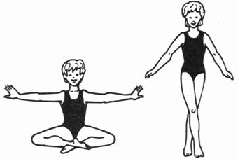 3. И. п. — сесть «по-турецки», руки свободно развести в стороны. С помощью рук подняться и перейти в положение стоя со скрещенными ногами. Развести руки в стороны и вернуться в исходное положение. Позднее, когда вы освоите это упражнение, переходите из положения сидя в положение стоя без помощи рук. 4—6 раз.
