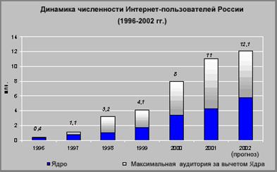 Пользователями Интернет в России, как и в других странах, являются в основном образованные профессионалы: 55 % имеют высшее образование, 50 % – профессионалы, 15 % – менеджеры и 18 % – студенты.
