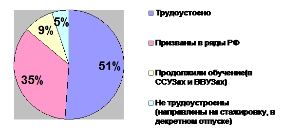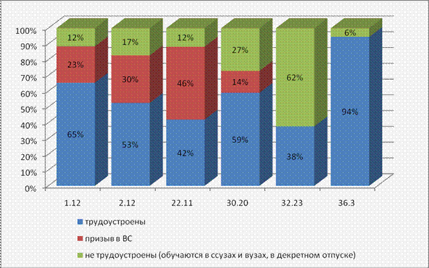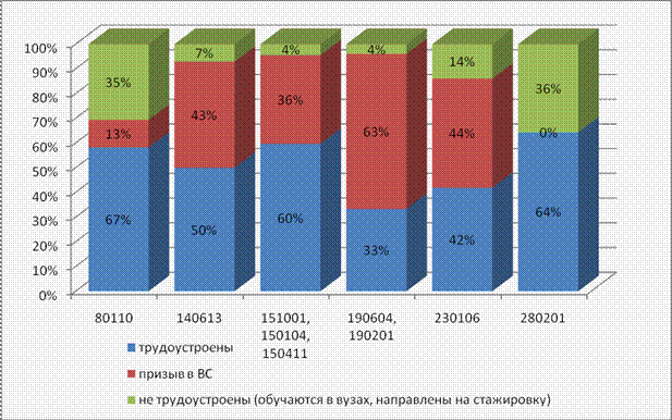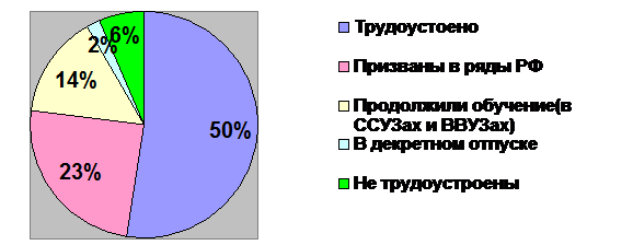Поэтому выпускники техникума успешно трудоустраиваются и адаптируются в различных сферах экономики региона. Это наглядно представлено на следующих диаграммах.