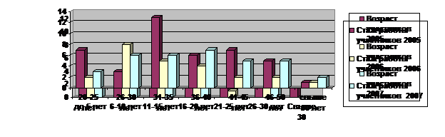 Из приведённой таблицы можно сделать вывод, что конкурс пользуется популярностью практически у всех возрастных категорий учителей. Наибольшее число участников относится к группе возрастов до 45 лет. Что подтверждается данными о педагогическом стаже участников конкурса из следущей таблицы.