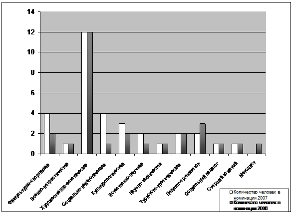 Самой многочисленной номинацией традиционно является художественно-эстетическая. Согласно Положению о городском этапе конкурса «Педагог-внешкольник-2007», номинация «Методист» в учебном году не представлялась на городском туре, именно поэтому окружной конкурс в вышеуказанной номинации не проводился.