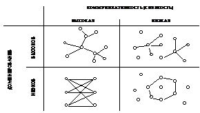 В системе с высокой связанностью и низкой доминантностью общее число связей распределено относительно равномерно таким образом, что потоки направлены от одного фрагмента системы к другому. Эта структура хорошо моделирует гипертекстовую коммуникацию, где не предусматривается контроля центра над периферией[6]. Система с низкой коммуникативностью и низкой доминантностью присуща диффузным, слабоинтегрированным популяциям. Система с низкой коммуникативностью и высокой доминантностью сосредоточивает связи в определенных ареалах сообщества и обозначает его декомпозицию. Такого рода «идеальные типы» сетей позволяют типологизировать различные виды коммуникации.