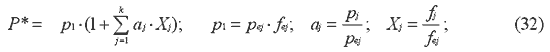 где P* — рыночная стоимость (равновесная цена); fj — элемент сравнения; fj и fej — количественные характеристики j-гo фактора сравнения соответственно для любого объекта сравнения и для некоторого специально подобранного «эталонного» объекта; pj = Pfj/fj – удельная характеристика ценности фактора единицы измерения, где Pfj — цена j-гo фактора размером fj.