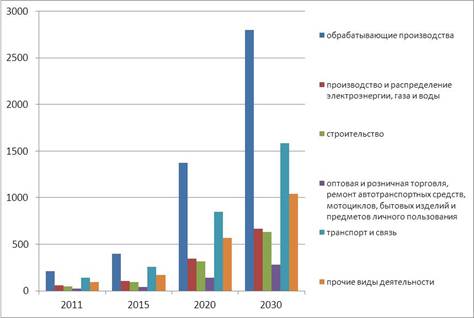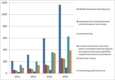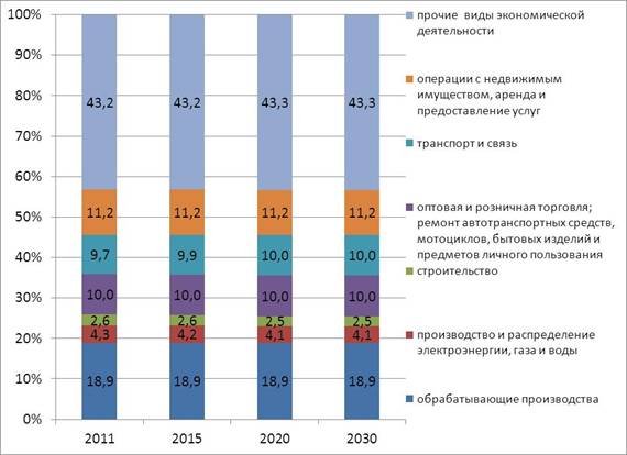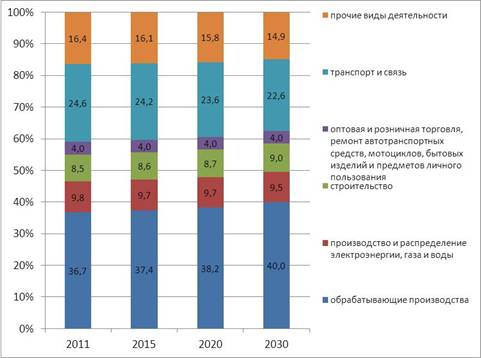 В структуре занятости доля занятых в малом бизнесе по полному кругу предприятий вырастет с 26,6% в 2011 г. до 29,0% в 2030 г. Среди организаций, не относящихся к субъектам малого предпринимательства, ведущую роль в обеспечении занятости будут по-прежнему играть обрабатывающие производства.