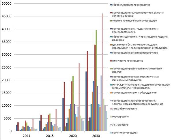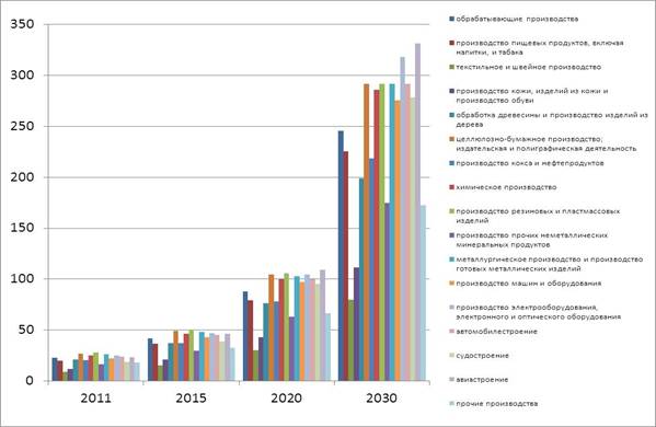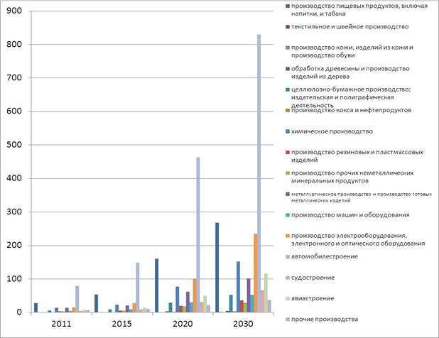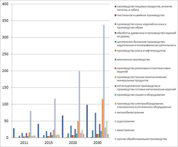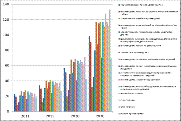В структуре обрабатывающих производств наиболее заметная тенденция будет связана с ростом доли базовых отраслей 1-й группы. К 2030 году доля этой группы в выпуске продукции обрабатывающих производств увеличится до 59,6%. К 2030 г. ведущую роль в структуре обрабатывающих производств по-прежнему будет играть автомобилестроение, на которое придется около 18% объема отгрузок; возрастет доля высокотехнологичных отраслей, прежде всего производства электрооборудования, электронного и оптического оборудования и авиастроения. За счет модернизации увеличится производительность труда (рис. 23).