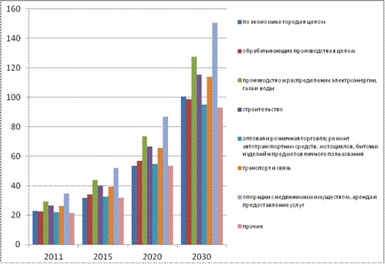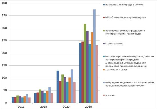 Реальная заработная плата в экономике города в целом к 2030 г. достигнет около 200 тыс. руб., реальная зарплата в ценах 2011 г. – 100 тыс. руб. Наиболее высокие значения уровня заработной платы сохранятся в непромышленных видах экономической деятельности, включая: «финансовый сектор», «операции с недвижимостью», «информационные технологии», «транспорт и связь», «производство и распределение электроэнергии, газа и воды» (рис. 24-25). В структуре обрабатывающих производств максимальный уровень зарплат будет отмечен в высокотехнологичных отраслях (рис. 26-27).