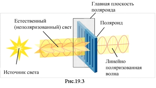 Свет называется линейно (или плоско) поляризованным, если колебания светового напряжённости электрического поля происходят в одной плоскости (плоскость ОXY на рис.19.1). Плоскополяризованный свет можно получить из естественного с помощью приборов, называемых поляризаторами (рис.19.3). Эти приборы свободно пропускают колебания, параллельные плоскости, которая называется главной плоскостью поляризатора, и полностью задерживают колебания, перпендикулярные к этой плоскости. Действие поляроида можно проиллюстрировать на механической модели (рис.19.4): упругая поперечная волна, распространяющаяся по шнуру, проходит беспрепятственно, если щель в преграде ориентирована так же, как и плоскость колебаний. Если плоскость колебаний перпендикулярна щели, колебаний за преградой не будет. То же и для электромагнитной волны (рис.19.5). С помощью поляризатора (поляроида) из пучка естественного света можно выделить часть, в которой колебания вектора