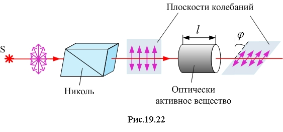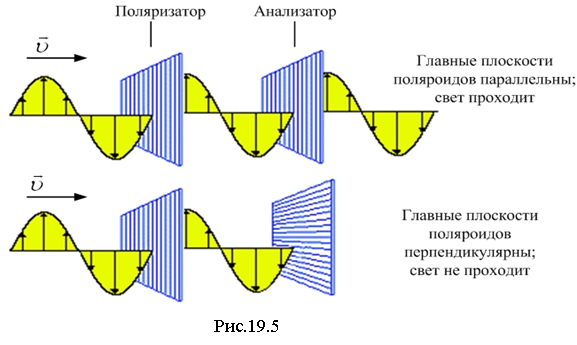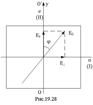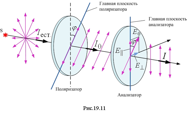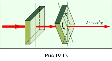 Поставим на пути естественного луча два поляризатора, главные плоскости которых образуют угол φ (рис.19.11). При вращении поляризатора вокруг направления естественного луча интенсивность прошедшего плоскополяризованного света остаётся одной и той же, изменяется лишь ориентация плоскости колебаний света, выходящего из прибора.