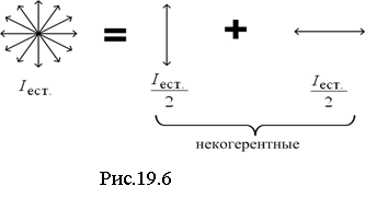 Естественный свет можно представить как суперпозицию двух некогерентных волн одинаковой интенсивности, линейно полиризованных во взаимно перпендикулярных плоскостях (рис.19.6). Отсюда получим, что, проходя через идеальный поляроид, естественный свет ослабляется вдвое: