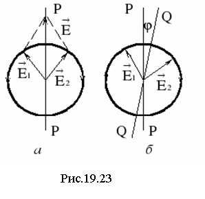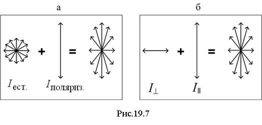 При прохождении естественного света через неидеальный поляроид свет становится частично поляризованным, то есть колебания светового вектора происходят во всевозможных направлениях, но существует преимущественное направление колебаний. Частично поляризованный свет можно представить как суперпозицию лучей естественного и линейно поляризованного (рис. 19.7, а), либо как суперпозицию двух некогерентных линейно поляризованных во взаимно перпендикулярных плоскостях лучей разной интенсивности (рис. 19.7, б).