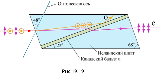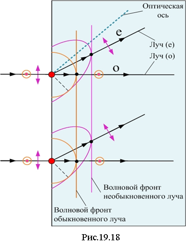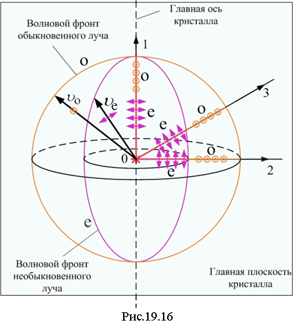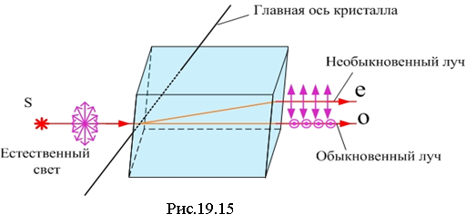 Оба луча, обыкновенный и необыкновенный, полностью поляризованы во взаимно перпендикулярных направлениях (см. рис.19.15). Плоскость колебаний обыкновенного луча перпендикулярна к главному сечению кристалла. В необыкновенном луче колебания вектора