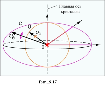 При прохождении света через некоторые кристаллы световой луч разделяется на два луча (рис.19.14 и 19.15). Это явление, получившее название двойного лучепреломления, было наблюдено в 1670 г. Эразмом Бартоломином для исландского шпата (разновидность углекислого кальция, СаСО3). При двойном лучепреломлений один из лучей удовлетворяет обычному закону преломления и лежит в одной плоскости с падающим лучом и нормалью. Этот луч называется обыкновенным и обозначается на чертежах буквой «о». Для другого луча, называемого необыкновенным (его принято обозначать буквой «е»), отношение