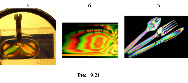 Пусть на анизотропную пластинку падает линейно поляризованный белый свет. Длины волн белого света имеют всевозможные значения в интервале приблизительно 380÷780 нм. Получающаяся в кристалле разность хода для лучей одних длин волн будет равна четному, для других – нечетному числу полуволн. Поэтому волны одних длин будут при интерференции уничтожаться, другие, наоборот, усиливаться. В результате отношение интенсивностей различных цветов будет иным, чем в белом свете, и кристалл будет казаться окрашенным. Каждой разности хода соответствует некоторая интерференционная окраска. Интерференционные окраски не являются чистыми монохроматическими спектральными цветами, но представляют собой смесь в различных пропорциях всех цветов, входящих в состав белого, кроме тех, которые уничтожаются при данной разности хода. Наблюдение и исследование интерференционных цветов