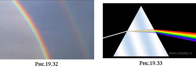 Явление дисперсии света наблюдали все, когда любовались радугой (рис.19.32). Её появление обусловлено полным внутренним отражением лучей в капельках воды, а также зависимостью показателя преломления от длины волны. Суть явления дисперсии можно записать как