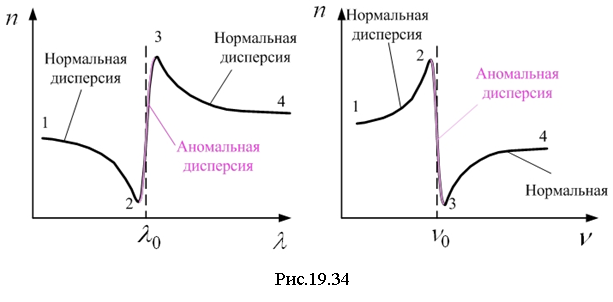 называемая дисперсией вещества, показывает, как быстро изменяется показатель преломления с длиной волны. Различают два вида дисперсии: нормальную (D<0), при которой показатель преломления монотонно увеличивается с ростом частоты; и аномальную (D>0), при которой показатель преломления уменьшается с увеличением частоты. Для всех прозрачных бесцветных веществ в видимой части спектра дисперсия нормальная (участки 1-2 и 3-4 на рис. 19.34). Если вещество поглощает свет в каком-то диапазоне длин волн (частот), то в области поглощения дисперсия оказывается аномальной (участок 2-3 рис. 19.34).