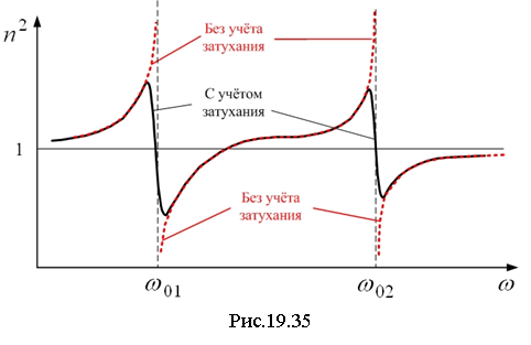. Такое поведение функции обусловлено тем, что мы пренебрегли затуханием: положили β=0. Когда β отлично от нуля, функция (19.30) при всех значениях ω остаётся конечной. На рис. 19.35 показан ход функции (19.30) без учёта затухания (пунктир) и зависимость n2=f(ω) с учётом затухания (сплошная кривая). Перейдя