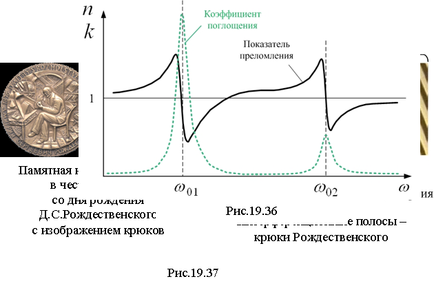 , имеет место аномальная дисперсия, а в остальных областях – нормальная. Области аномальной дисперсии являются резонансными областями. При резонансе за счёт вынуждающей силы (19.21) амплитуда вынужденных колебаний максимальна, при этом обеспечивается максимальная скорость поступления энергии в систему, световая волна поглощается. Таким образом, области аномальной дисперсии, вследствие их резонансного характера, являются областями поглощения. На рис.19.36 пунктирная кривая изображает ход коэффициента поглощения света веществом.