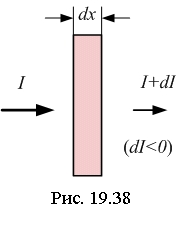 Ещё в 18 веке Бугер экспериментально, а Ламберт теоретически установили закон поглощения света. При прохождении света через тонкий слой поглощающей среды в направлении x уменьшение интенсивности света dI пропорционально самой интенсивности I и толщине пройденного слоя dx (рис.19.38):