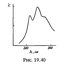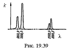 Коэффициент поглощения зависит от длины волны света λ (или частоты ω). У вещества, находящегося в таком состоянии, что атомы или молекулы практически не воздействуют друг на друга (газы и пары металлов при невысоком давлении), коэффициент поглощения для большинства длин волн близок нулю и лишь для очень узких спектральных областей обнаруживает резкие максимумы (на рис.19.39 показан спектр паров натрия). Эти максимумы, согласно элементарной электронной теории Лоренца, соответствуют резонансным частотам колебаний электронов в атомах. В случае многоатомных молекул обнаруживаются также частоты, соответствующие колебаниям атомов внутри молекул. Так как массы атомов гораздо больше массы электрона, молекулярные частоты намного меньше атомных – они попадают в инфракрасную область спектра.