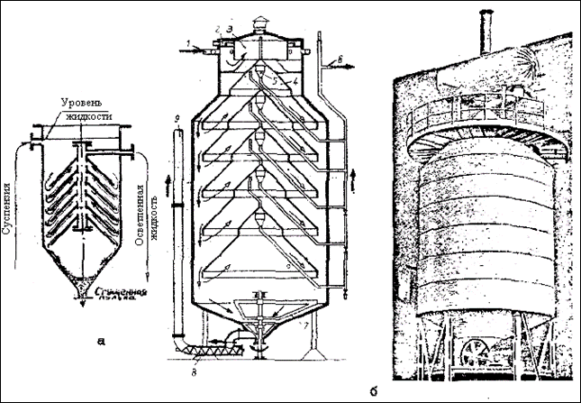 Рис. 20. Устройство непрерывно действующего отстойника для суспензий с коническими тарелками /а/ и аппарат диаметром 4,4 м и высотой 11 м /б/.