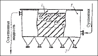 1. Kopпyс. 2. Наклонная перегородка. 3. Бункер для осадка.