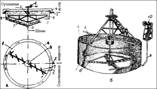 1. Цилиндрический корпус диаметром до десятков метров. 2. Слегка коническое днище. 3. Ввод суспензии. 4. Кольцевой желоб для сбора осветленной жидкости. 5. Вывод осветленной жидкости. 6. Медленно вращающиеся рамы /от одной до четырех/. 7. Косо укрепленные на рамах гребки, передвигающие без взмучивания осадок от периферии к центру днища. 8. Привод. 9. Вывод сгущенной суспензии. 10. Диафрагмовый насос.