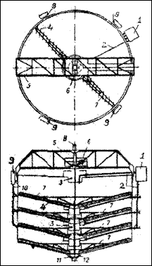 1. Приемник исходной суспензии. 2. Трубы для ее подвода внутрь аппарата. З. Горловины для исходной суспензии. 4. Скребки. 5. Несущая ферма. 6. Привод. 7. Рамы. 8. Устройство для подъема рам. 9. Коллекторы осветленной жидкости. 10. Трубы для вывода жидкости из внутренней части аппарата. 11. Разгрузочный конус. 12. Конусный скребок.