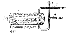 1. Штуцер для ввода эмульсии. 2. Перфорированная отбойная перегородка. 3 и 4. Отводы легкой и тяжелой фазы соответственно. 5. Устройство для разрыва сифона, предотвращающее полное опорожнение