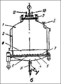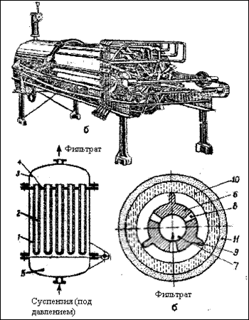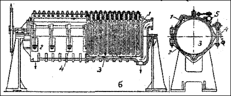 Рис. 25. Устройство открытого нутч-фильтра и закрытый нутч-фильтр /б/, работающий под избыточным давлением до 3 ат.