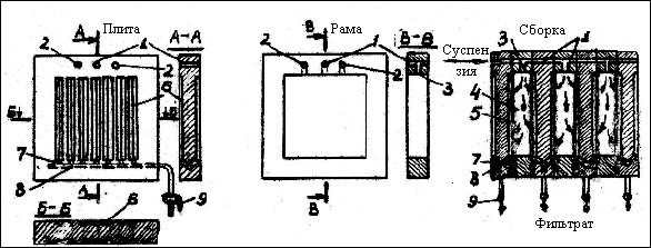 1. Отверстия в плитах и рамах для подачи исходной суспензии, образующие при сборке единый канал. 2. Отверстия в плитах и рамах для подачи промывной жидкости, также образующие при сборке единые каналы. 3. Отводы для прохода суспензии внутрь рам. 4. Внутренние пространства рам, в которые подается исходная суспензия и где скапливается осадок. 5. Фильтровальные салфетки, зажимаемые между плитами и рамами. 6. Рифления плит в виде желобков, предотвращающие прилипание фильтровальной ткани к поверхностям плит и обеспечивающие дренирование фильтрата. 7. Каналы в плитах для вывода фильтрата /на стадии фильтрования/ или промывной жидкости /при промывке осадка/. 8. Центральные каналы в плитах для сбора фильтрата или промывной жидкости.