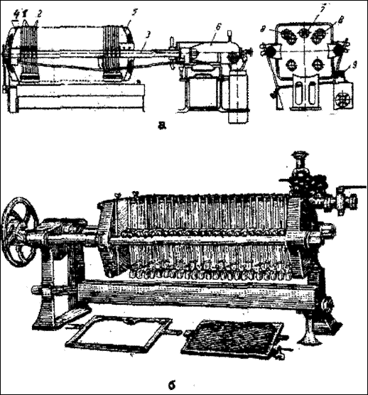 1. Плиты. 2. Рамы. З. Опорный брус. 4. Неподвижная плита. 5. Подвижная плита. 6. Гидравлическая система для сжатия всей сборки. 7. Штуцер для подачи суспензии. 8. Штуцера для подачи промывной жидкости. 9. Краны для удаления фильтрата.