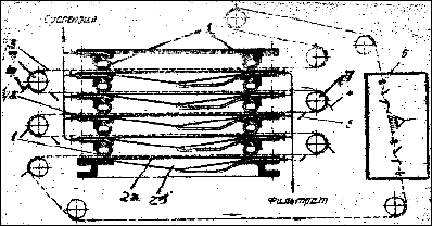 Рис. 26. Устройство и схема работы фильтр-пресса /на сборке показана стадия фильтрования/.