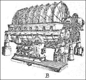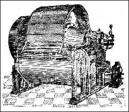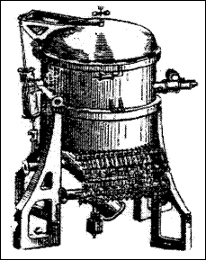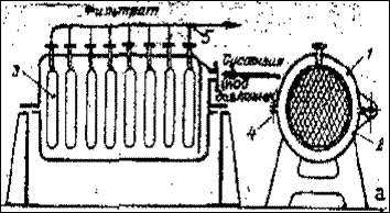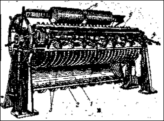 1. Кожух. 2. Перфорированный барабан, вращающийся на полом валу 3 с постоянной скоростью. 4. Вал-шток. 5. Поршень-толкатель, приводимый автоматическим устройством 6 во вращательное /скорость вращения вала-штока 4 и поршня 5 – та же, что и у барабана 2/ и возвратно-поступательное движение; поршень делает 10-16 ходов в минуту, причем при каждом ходе вправо, составляющем примерно