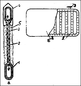 б – прямоугольный фильтрующий элемент из труб. 1. Рама из перфорированных труб. 2. Фильтрующая ткань /сшитая или соединенная молнией/. 3. Патрубок для выхода фильтрата /или промывных вод/ и для подачи сжатого воздуха /при разгрузке осадка/.