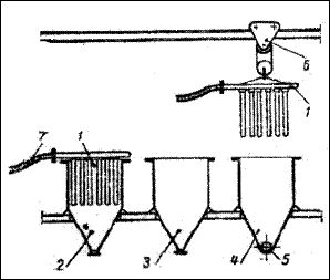 1. Батарея фильтрующих элементов. 2. Резервуар для суспензии, при помещении батареи в которой идет фильтрование под ваккумом. 3. Резервуар для промывной жидкости, при помещении батареи в который идет промывка осадка под вакуумом. 4. Бункер, в который сбрасывается осадок /отдувкой сжатым воздухом или гидросмывом/. 5. Шнек для удаления осадка. 6. Тельфер. 7. Гибкий шланг, по которому поочередно отсасываются под вакуумом фильтрат /в сборник фильтрата/ и промывные воды /в их сборник/ и подаются сжатый воздух или жидкость для регенерации фильтрующих элементов.