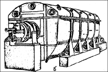 Рис. 47. Непрерывно действующая отстойная центрифуга со шнековой выгрузкой осадка /а/: устройство /а/ и разрез /б/.