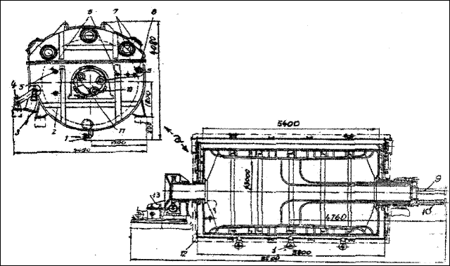 1. Штуцера подачи суспензии. 2, 8. Вводы инертного газа. 3. Выход осадка из разгрузочного шнека. 4. Насос для смазки. 5. Штуцер для регулятора уровня суспензии. 6 и 9. Вводы и вывод промывной жидкости. 7. Смотровые люки. 10. Выход фильтрата. 11. Ввод газа отдувки. 12. Тепловая изоляция. 13. Редуктор.