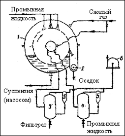 1. Фильтр. 2. Шнек. 3. Вакуум-сборник фильтрата. 4. Вакуум-сборник промывной жидкости. 5. Брызгоуловители. 6. Вакуум-насос.