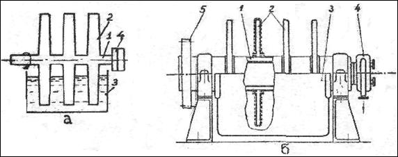 1. Вращающийся с большой скоростью вал /вертикальный или горизонтальный/. 2. Сплошной /а/ или дырчатый /б/ барабан. 3.Кожух. 4. Фильтрующая ткань.
