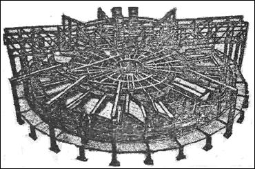 1. Круглые рамы, откидывающиеся при повороте вокруг вала 2, в то время как плиты 3 остаются неподвижными.