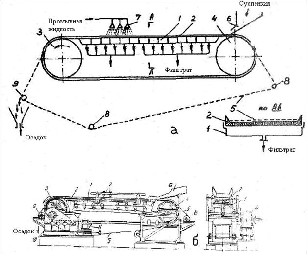 1. Стол с вакуум-камерами. 2. Медленно движущаяся бесконечная резиновая лента с отверстиями. 3. Приводной барабан. 4. Натяжной барабан. 5. Фильтрующая ткань. 6. Лоток для подачи суспензии. 7. Форсунки для распыления промывной жидкости. 8. Натяжные ролики. 9. Валик для съема осадка. 10. Редуктор. 11. Электродвигатель.