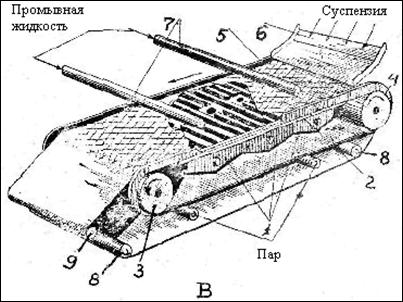 Рис. 42. Ленточный вакуум-фильтр: устройство /а/, виды /б/ и наглядное изображение /в/.