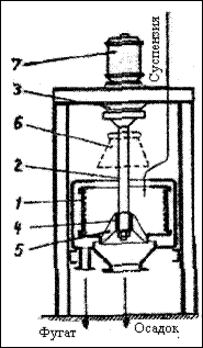 1. Дырчатый барабан. 2. Вал. 3. Опора вала. 4. Упорная втулка с ребрами. 5. Ребра втулки. 6. Колпак, который во время центрифугирования опущен и закрывает разгрузочные окна между ребрами 5 втулки, а при выгрузке осадка поднят или вынут, причем осадок вручную проталкивается вниз. 7. Электродвигатель.
