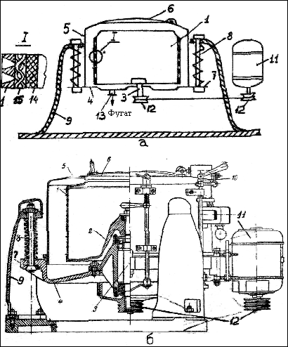 центрифуга. 9. Три опорные колонны. 10. Ручной тормоз. 11. Электродвигатель. 12. Шкивы привода. 13. Штуцер для фугата. 14. Фильтрующая ткань. 15. Проволочная дренажная сетка.